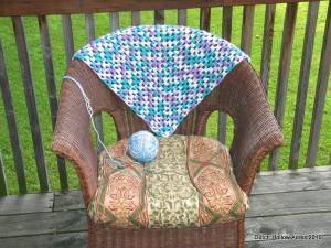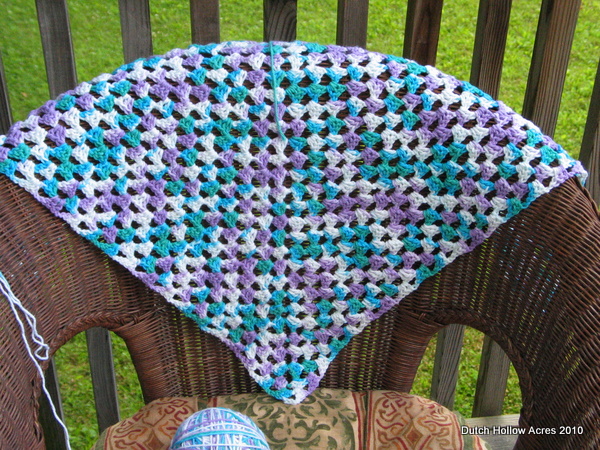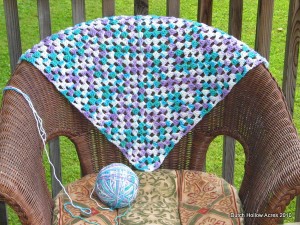Here is my progress thus far. I’m hoping it’ll end up being a 1 skein shawl. When I finish I’ll write up the pattern I decided on and post it.