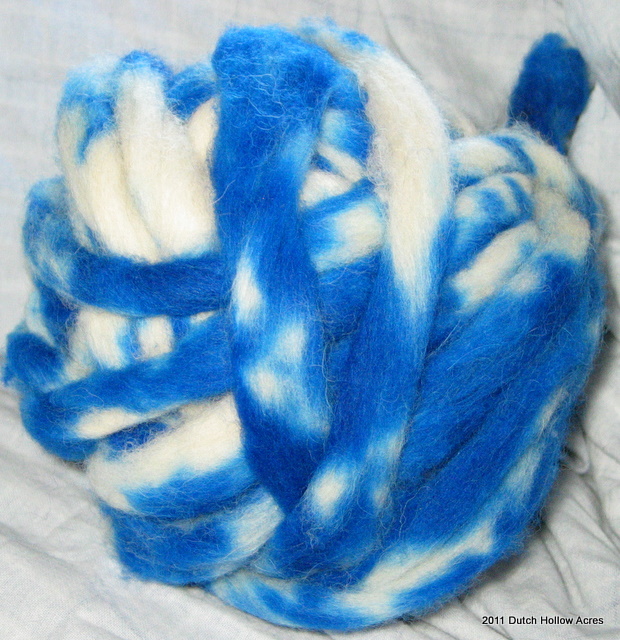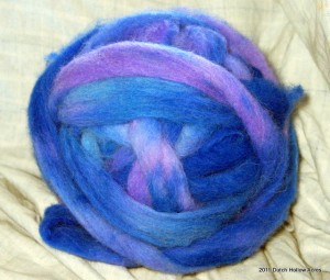 Lastly I couldn’t keep my hands off my spinning wheel and worked up 2 skeins and dyed them last weekend.  The darker one is a 2 ply sport weight and the lighter one is a silver beaded single ply.  Both are alpaca/wool blends just like the rovings you see above.   Both are for sale in our Etsy Shop.