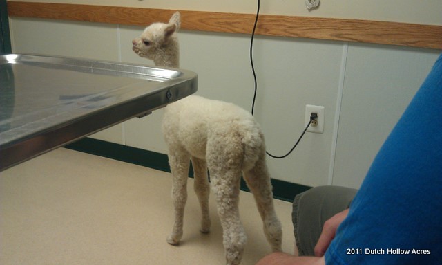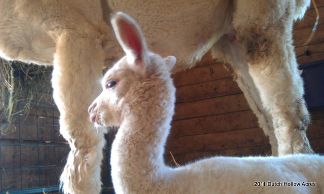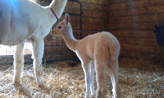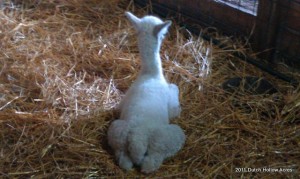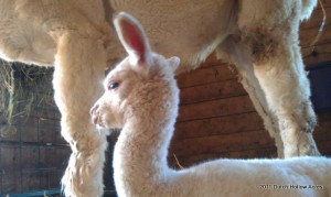 I have a theory, when one alpaca has a cria all the others within 2-3 weeks of their due date follow shortly after. Crystal decided to have her little girl 2 weeks early on me. Little Liberty at Dutch Hollow was born yesterday. I shouldn’t say little because she weighed in at 21 lbs but you could tell she needed to cook just a little longer. She was a bit shakey on her new legs and tendons aren’t tight yet in her hind legs, but everything else was good. Good heart, lungs, suck reflex, HUGE ears, and teeth already erupted.