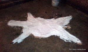 Since I’ve been sick like a dog this week I really don’t have much to share fiber arts wise.  Sniffling, sneezing, coughing and crocheting really doesn’t mix well.  I prefer not to germ up anything I will potentially sell to a customer.   Which means the only fiber project I currently have been tending to is an alpaca hide I’m drying.    The weather has been so darn wet and crappy this month that the thing just won’t dry.  Usually I salt them out in the barn but the salt has been sucking up all the humidity from the air and bringing it to the hide instead of taking it away.  So, at the moment the salted hide is drying in my basement next to a dehumidifier.  In another week it should be dry and ready to send off to Sivko Furs for tanning and to be made into a blanket.   For more information on how to preserve an alpaca hide read this post.